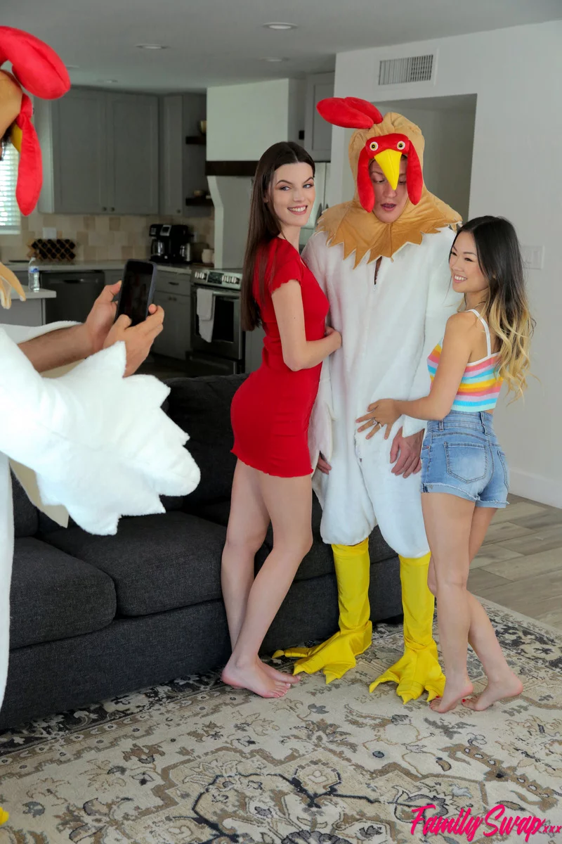 Фиона Фрост и Лулу Чу сидят верхом на мужчинах в костюмах цыплят