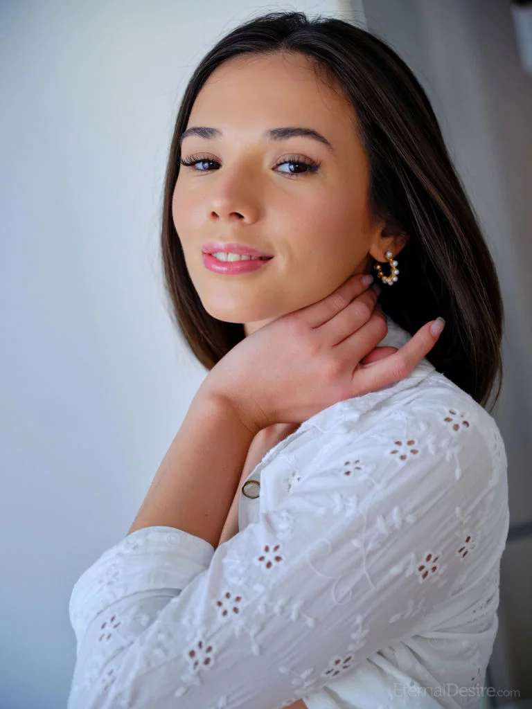 Красивая молоденькая Ева Свит показывает свои натуральные сиськи и сладкую киску на кухне