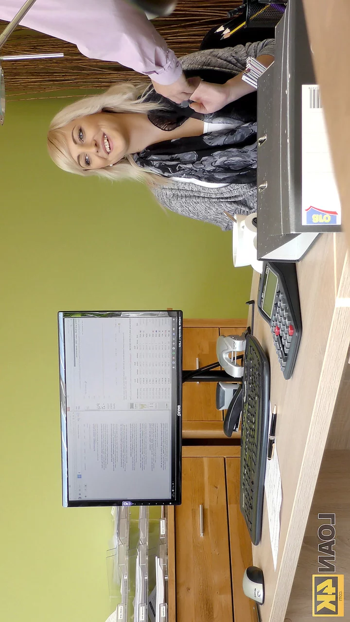 Молоденькая блондинка Кэти Роуз занимается сексом на рабочем столе с кредитным агентом