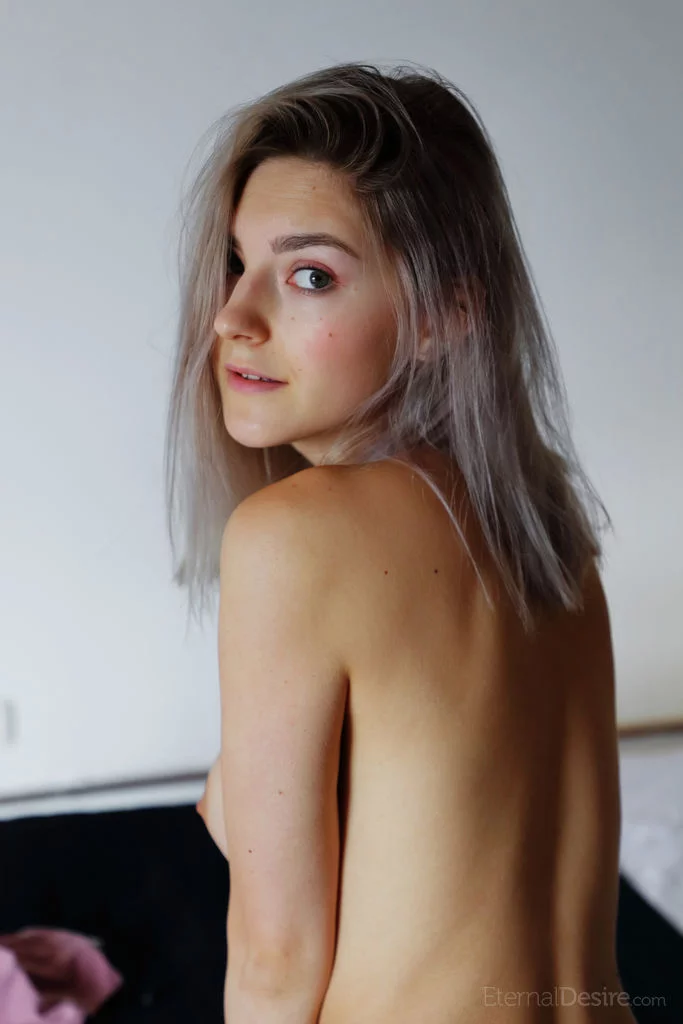 Молоденькая платиновая блондинка Ева Элфи теребит пальцами свою возбужденную киску на своей кровати