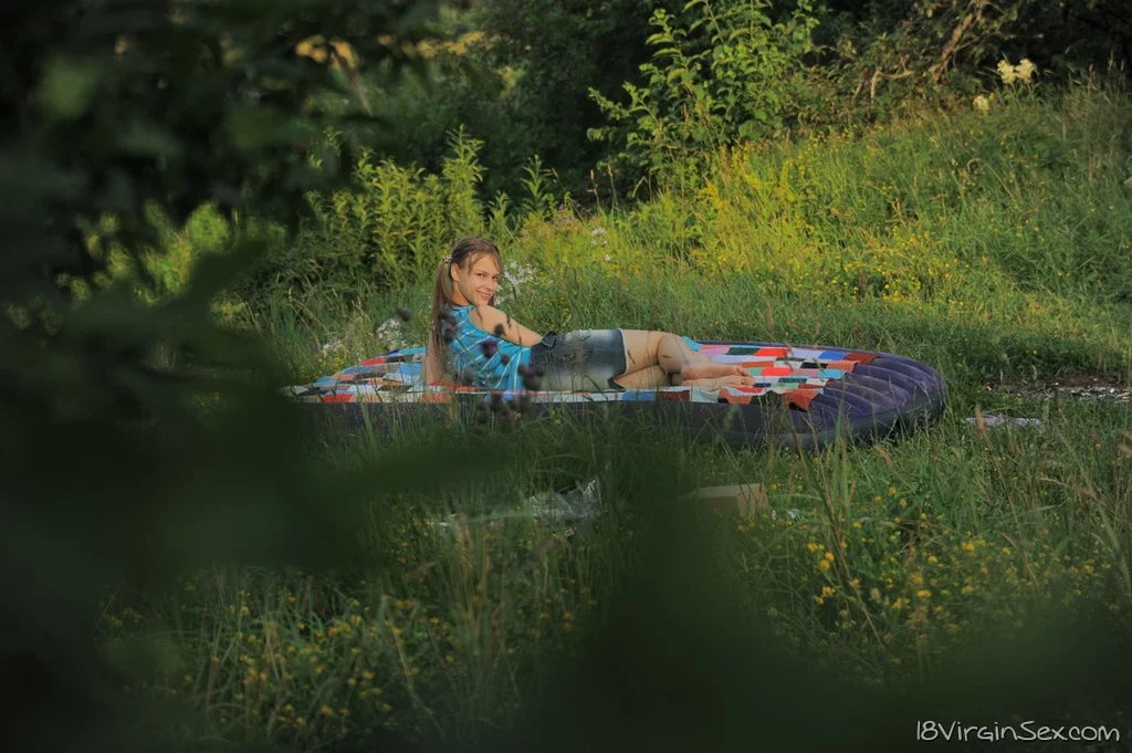 Молодо выглядящая девушка Оксана теряет свою девственность с двумя парнями в поле