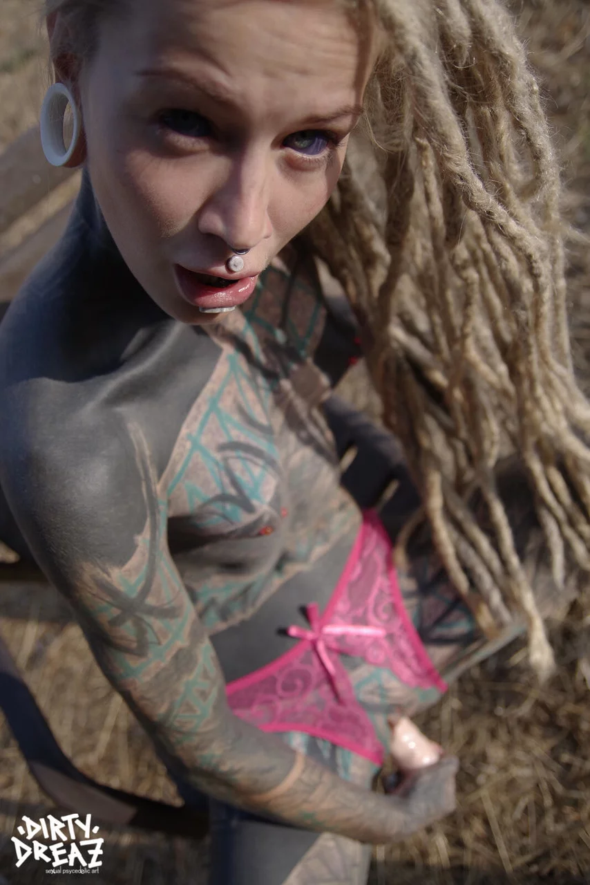 Полностью татуированная девушка Anuskatzz сосет фаллоимитатор, трогая свою киску