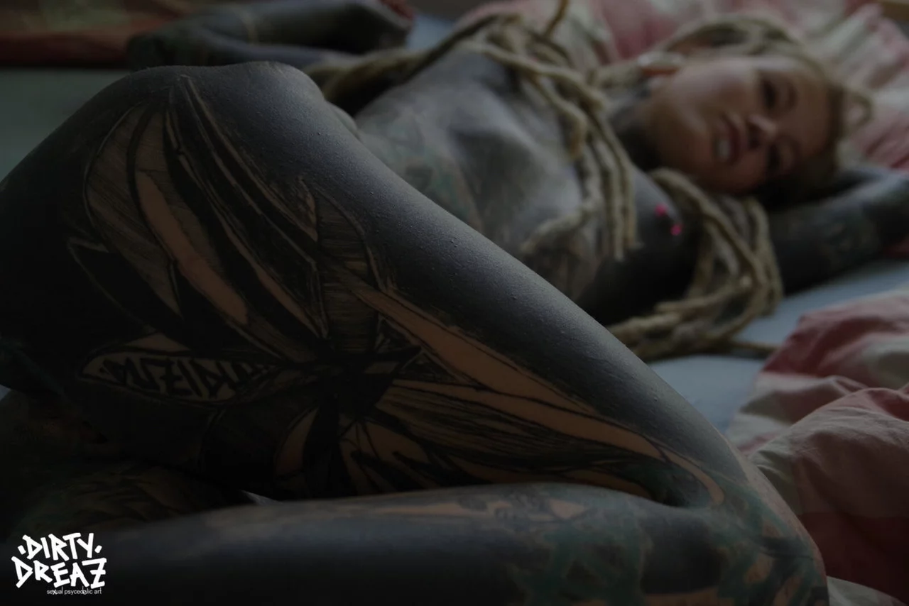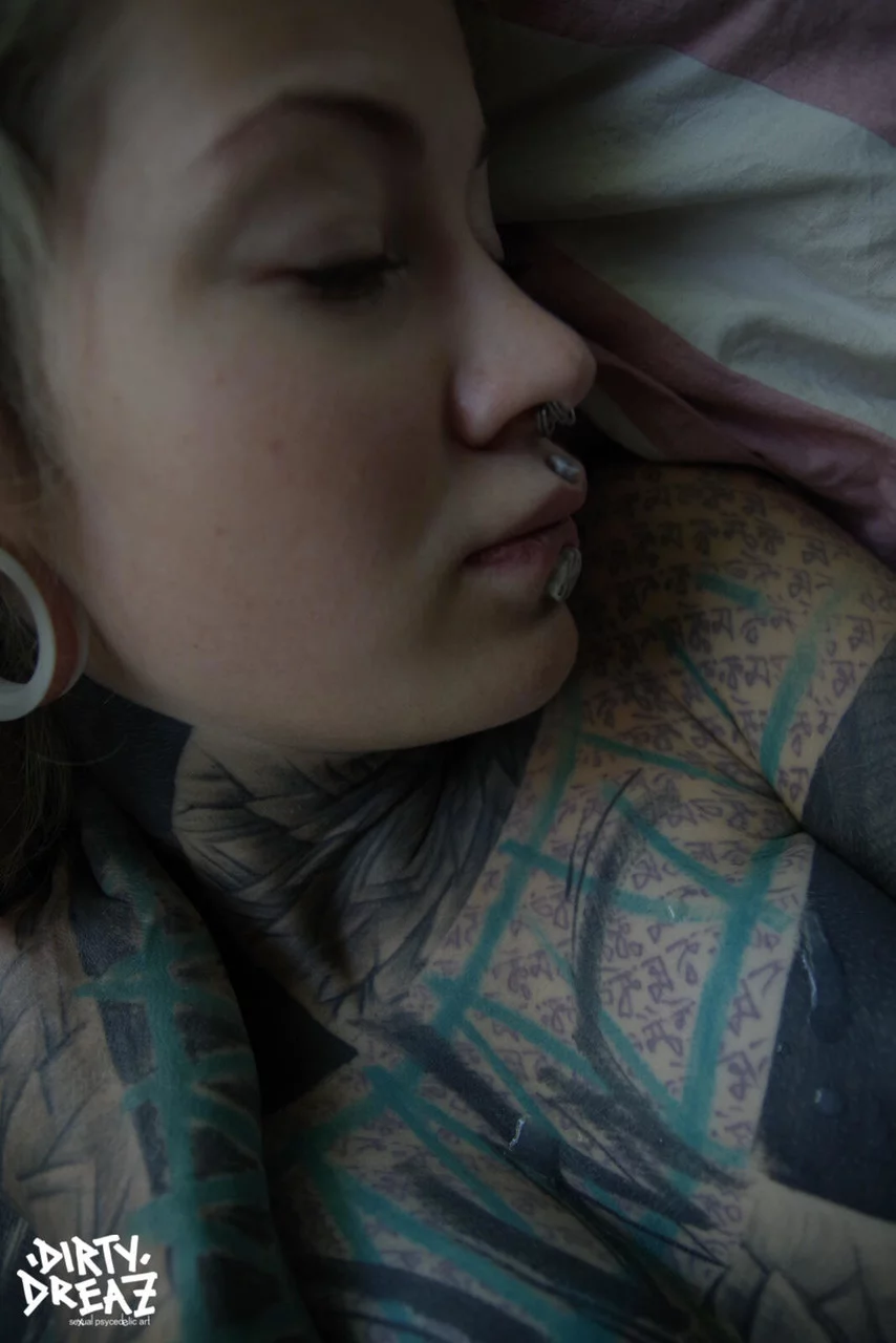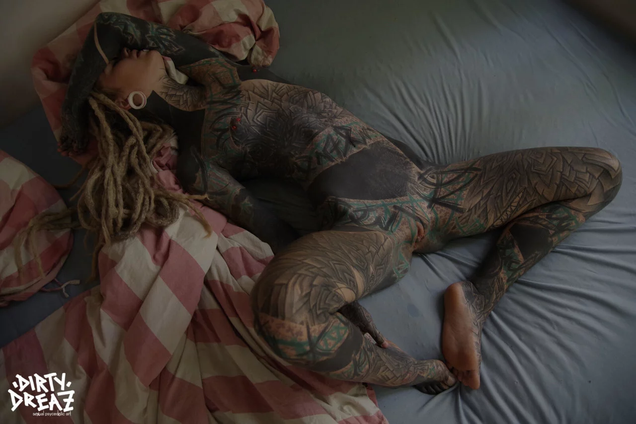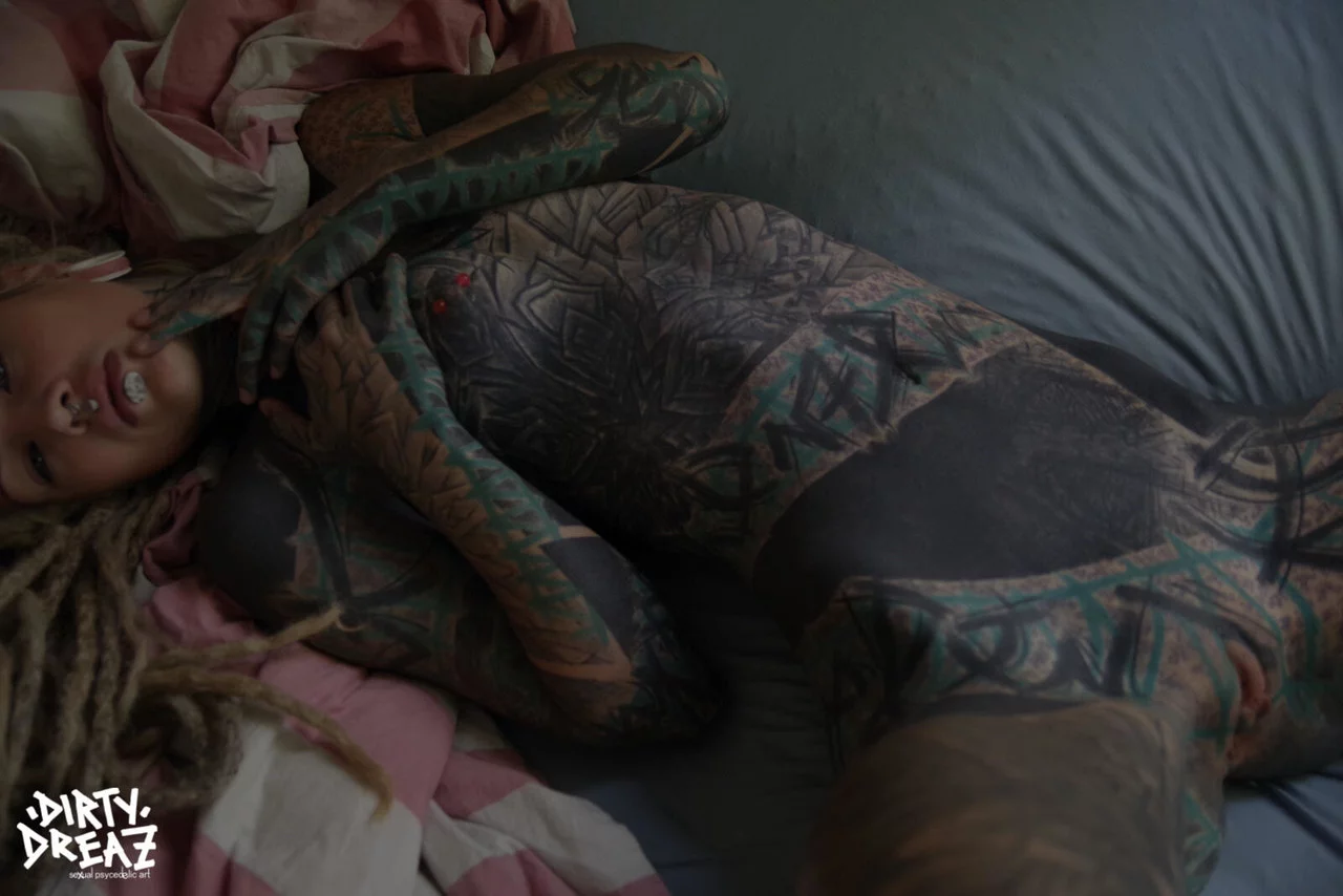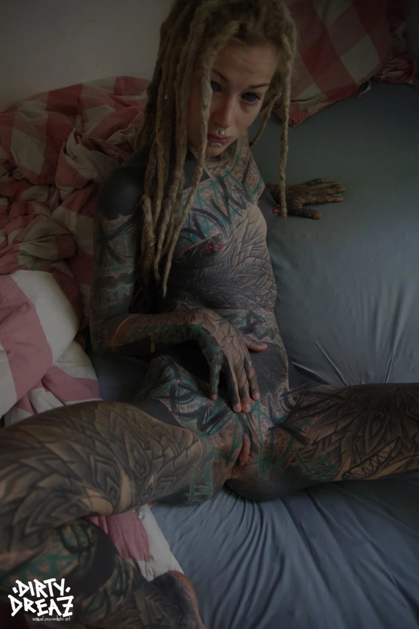 Сильно татуированная девушка Anuskatzz засовывает палец в свою обнаженную киску