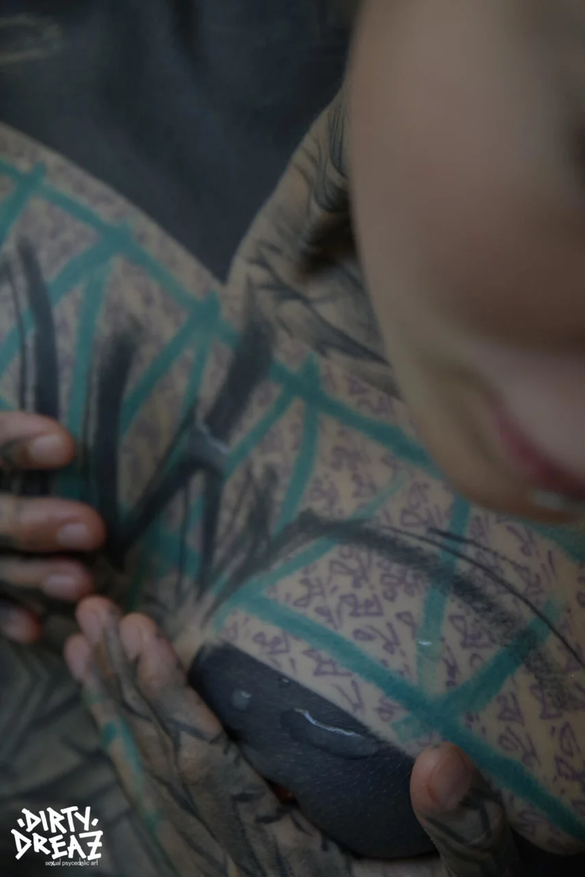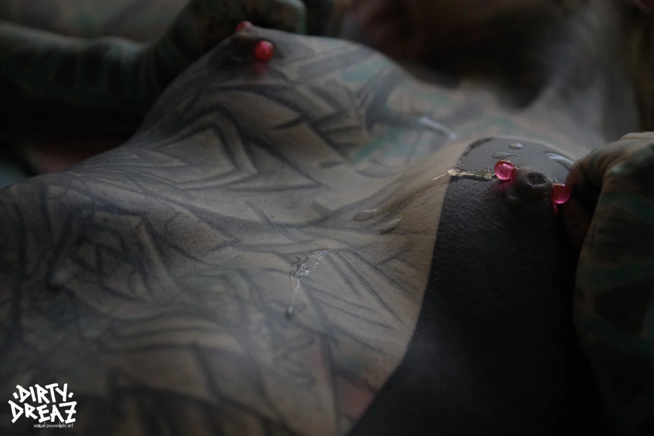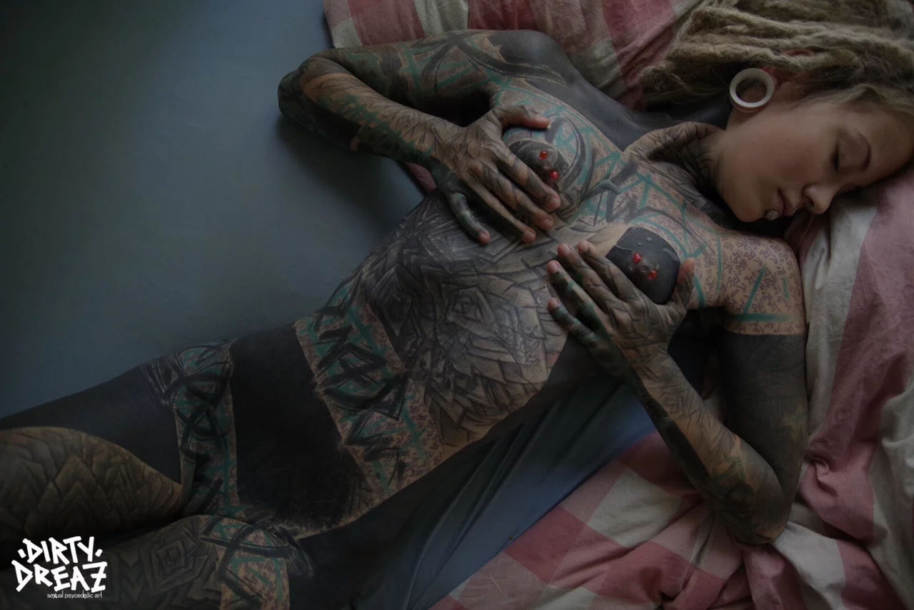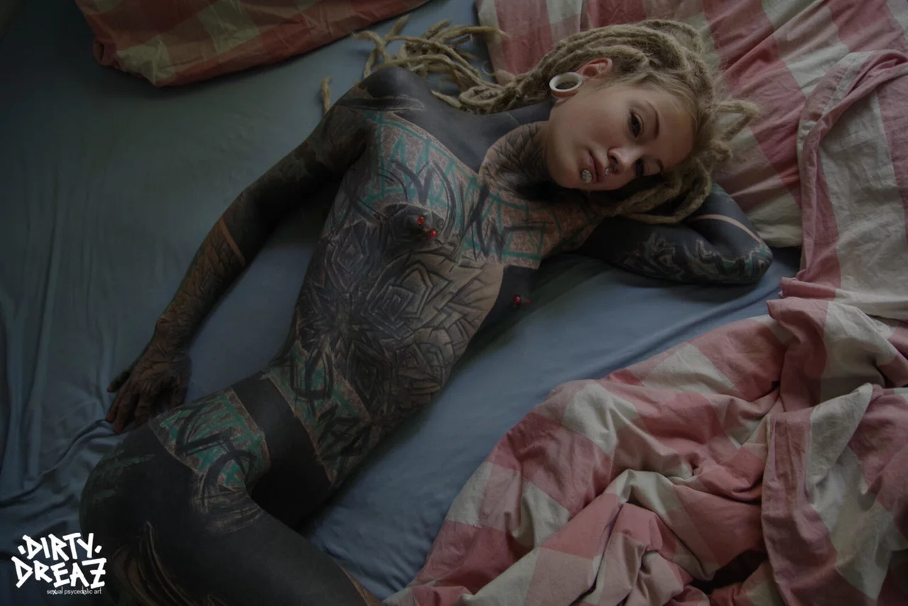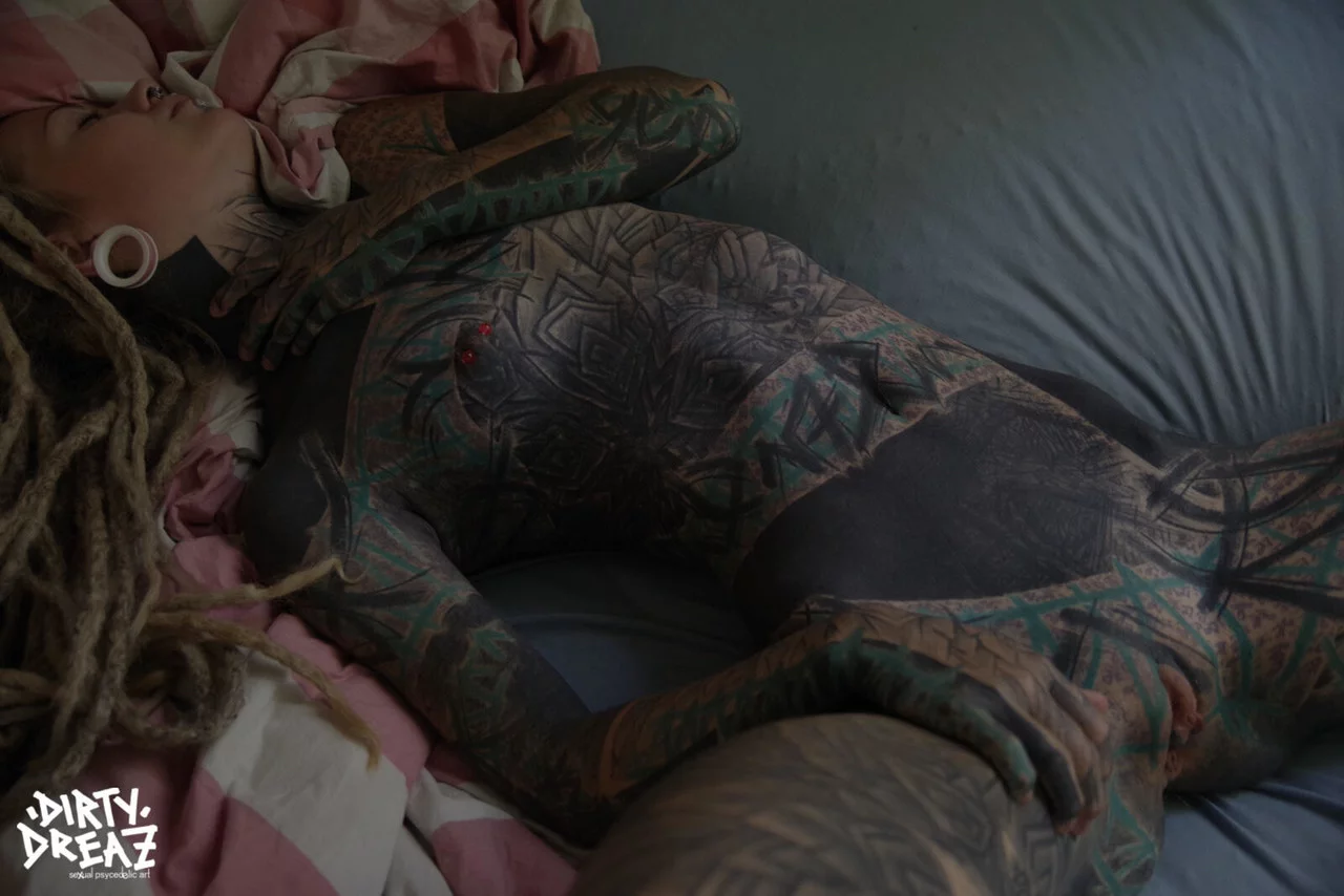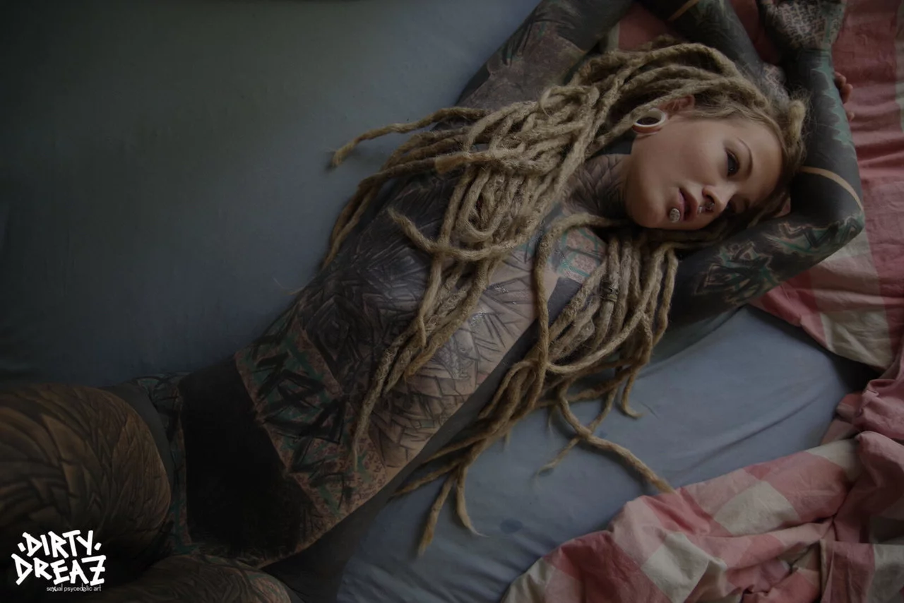 Сильно татуированная девушка Anuskatzz засовывает палец в свою обнаженную киску