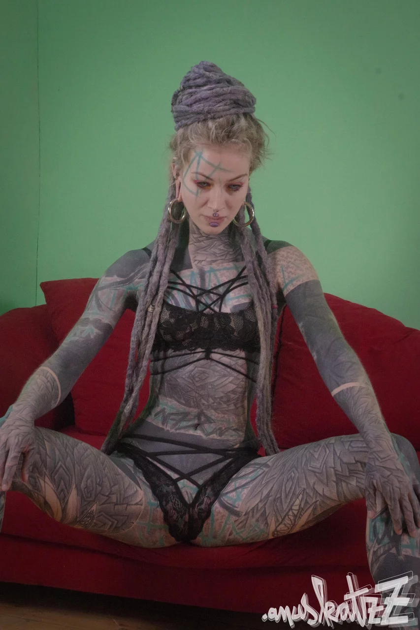 Сильно татуированная девушка дрочит дилдо в своей заднице до и после отсоса члена