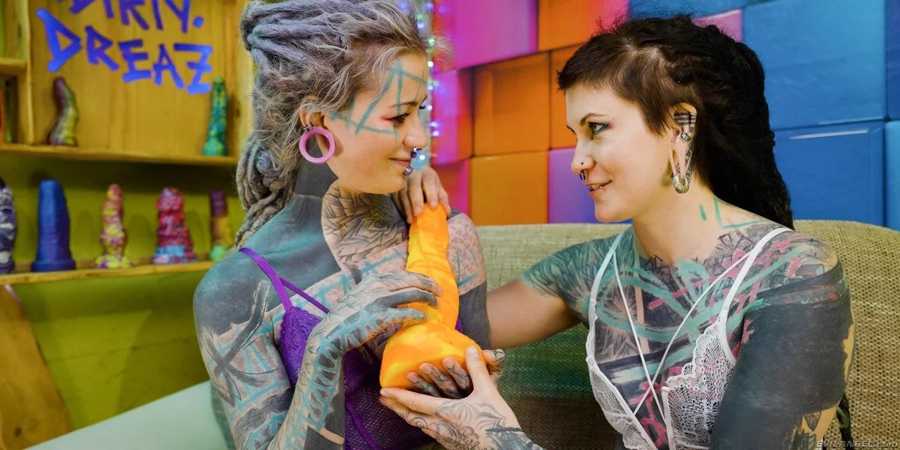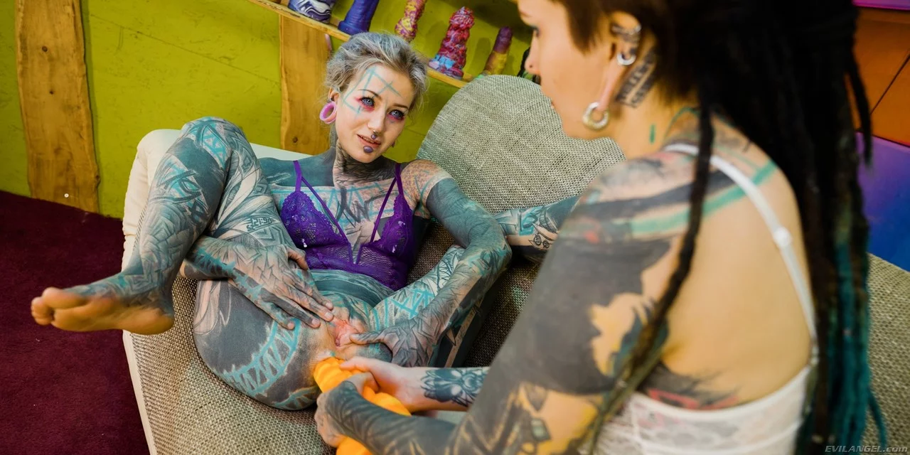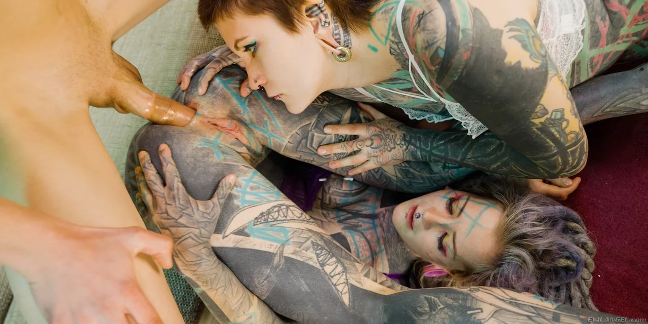Сильно татуированные девушки занимаются сексом втроем со своим другом-мужчиной