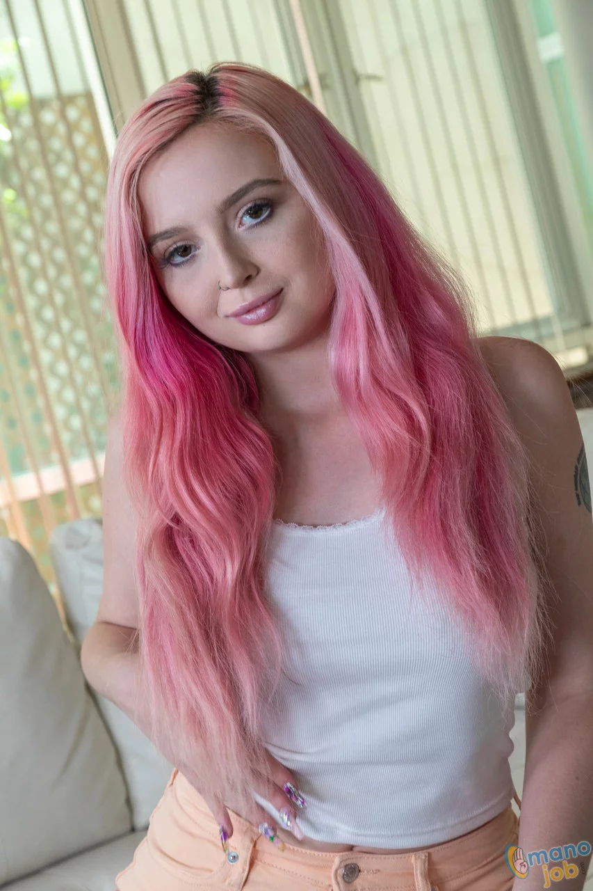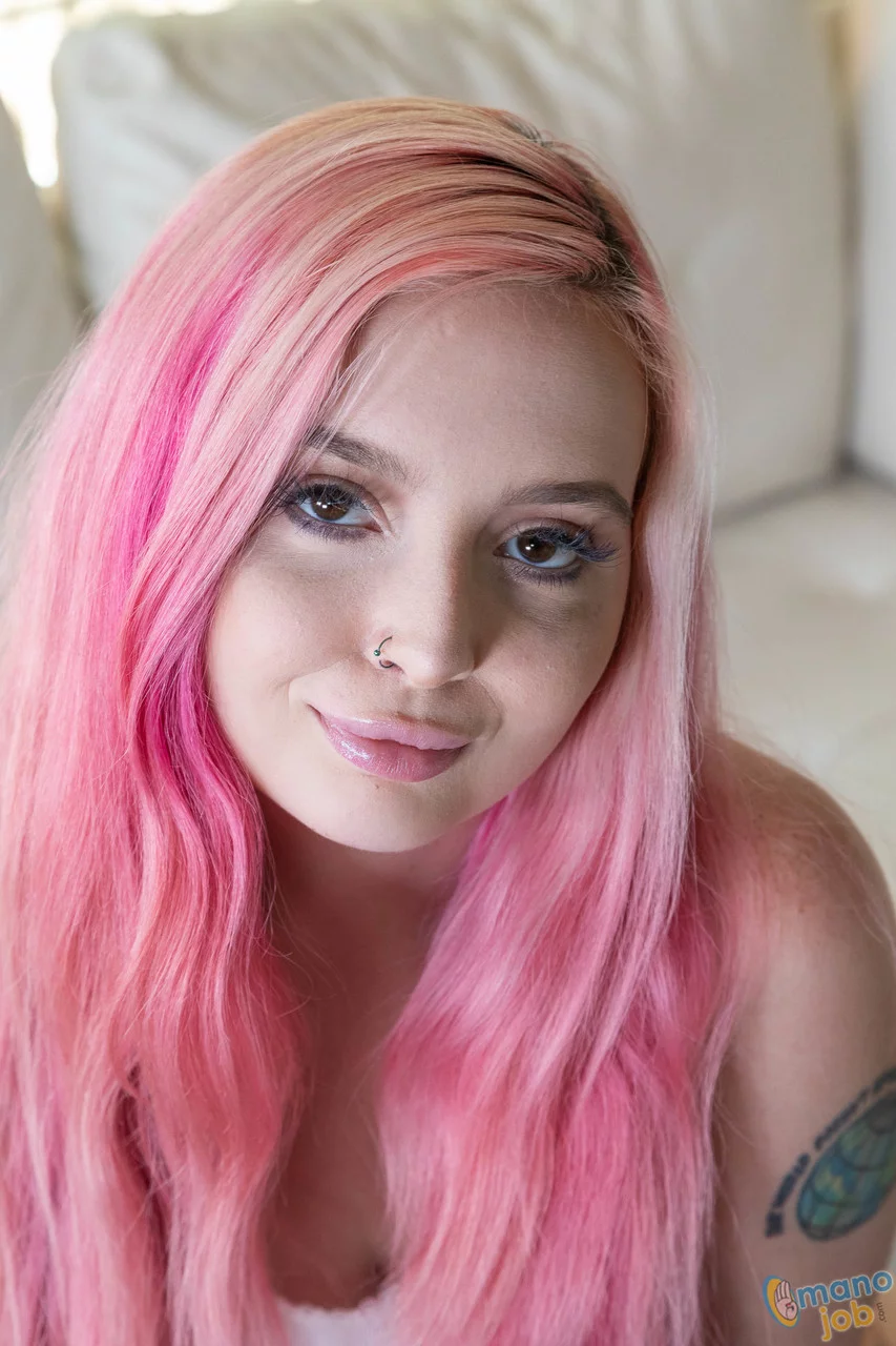 Симпатичная девушка с розовыми волосами и проколотыми сосками ублажает член в режиме POV