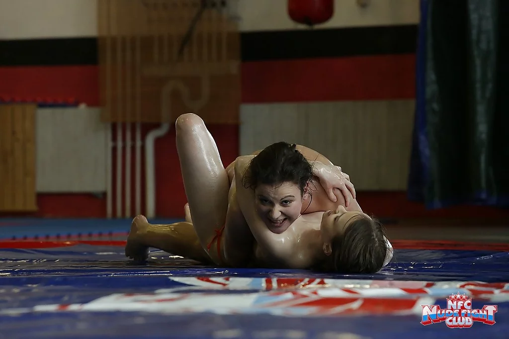Возбужденные смазанные милашки в трусиках-стрингах борются за лесбийское доминирование